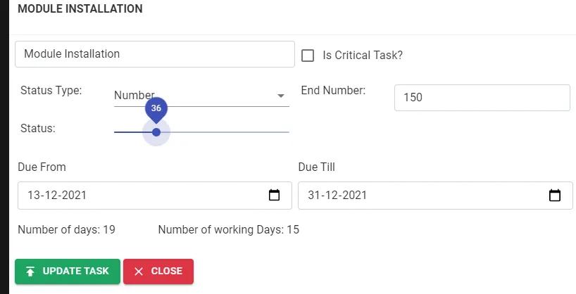 Step 3: Use the slider to select the progress of the status e.g. 36 of 150 modules was installed
