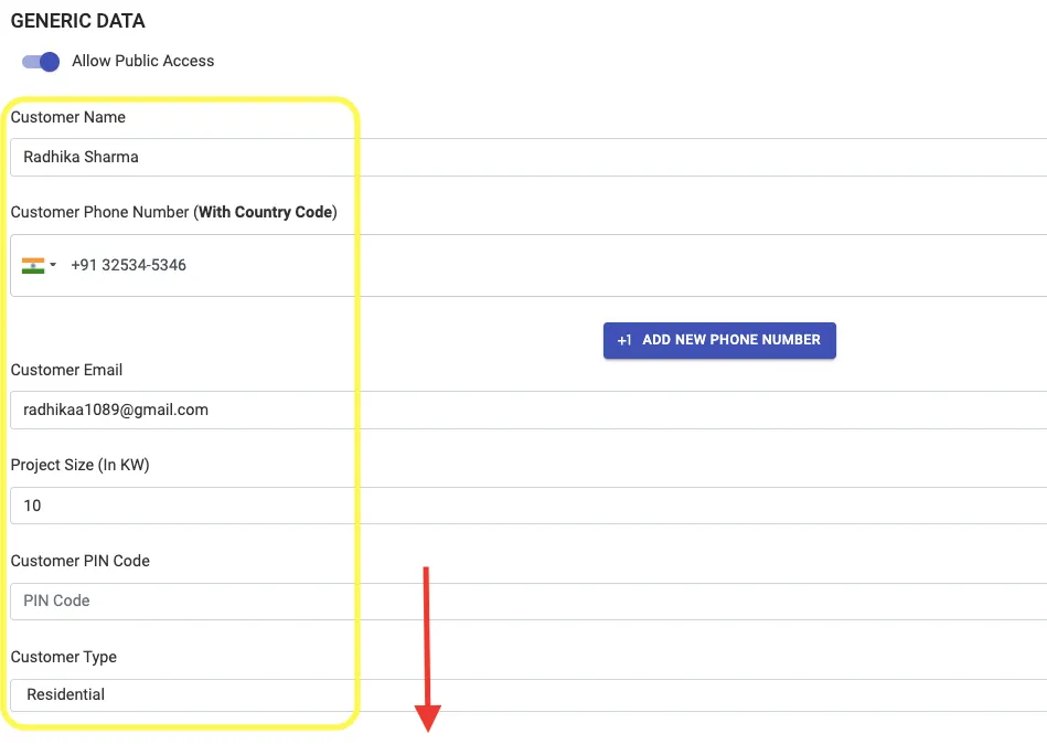 Scroll down to find Generic Data that both you and customer can fill. When customer uses the link you provided, they will be able to fill out all details for you and the same will be reflected on this page and can also be edited/filled up by you.