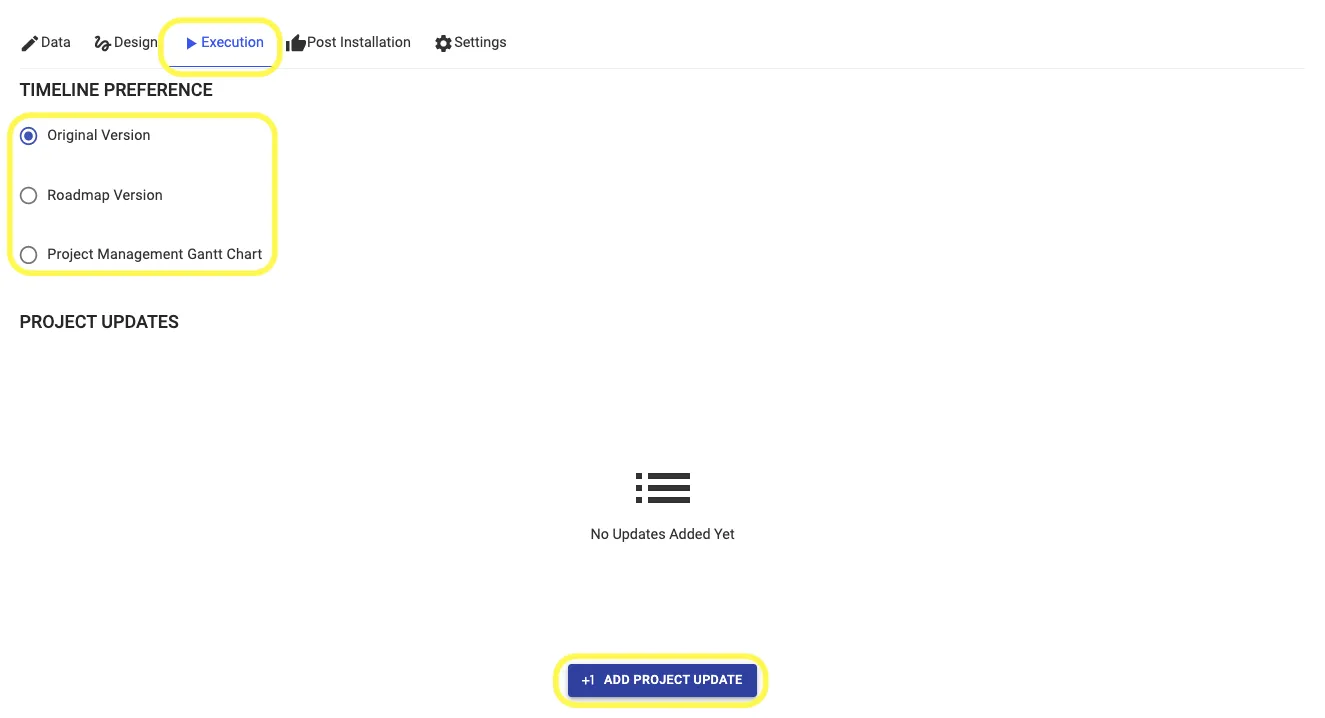 Step 7: Go to Execution Tab and Select a timeline preference and keep adding project updates as an when there is an Update.